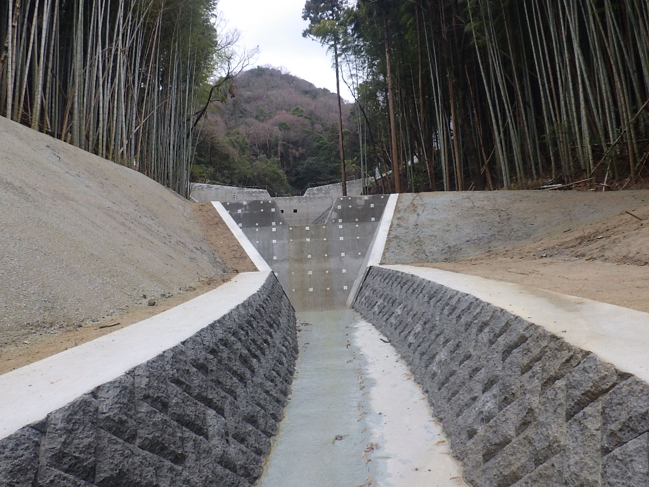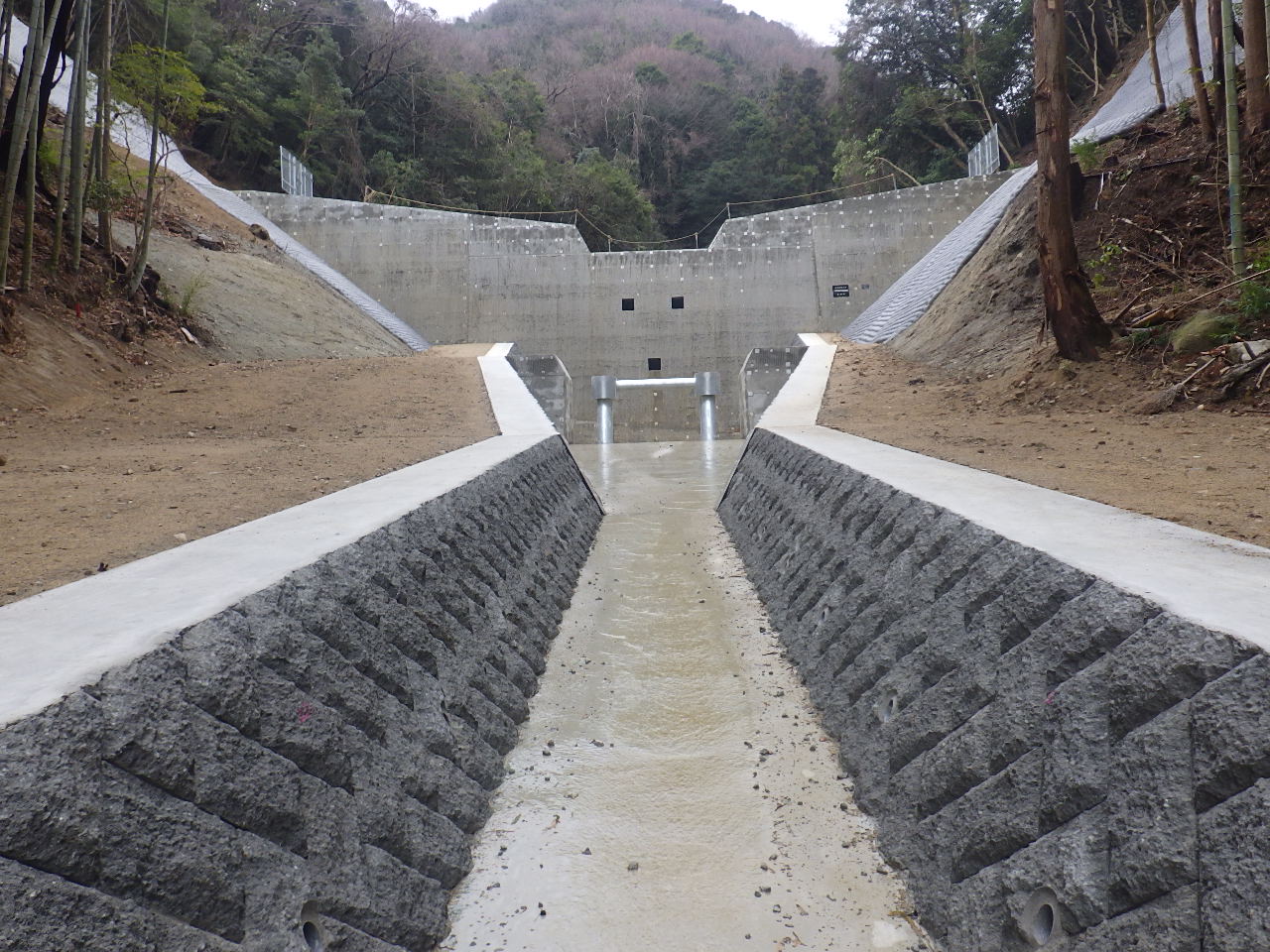 | 工事内容 | 土砂渓流危険区域内での砂防ダムの構築工事であったので工事期間中は土砂災害や洪水災害の発生抑止の対策が求められました。工事範囲のすぐ下には民家が多数あったので災害発生時の連絡等が円滑に行うことができるようにするため地域とのコミュニケーションを大切にして作業を進めました。洪水時に水路の氾濫を防ぐため工事範囲内に簡易泥溜めを複数個所設置することで台風時に下流域で氾濫していた水路が氾濫しなくなり地域の人々に喜んで頂くことができました。砂防ダムのコンクリート工事が夏期の期間であったので夏場のコンクリートの品質管理には様々の養生方法を実施し品質向上に努めました。コンクリートの品質管理方法や工事期間中の自然災害の抑止を検討・実施を多く学んだ工事となりました。 |