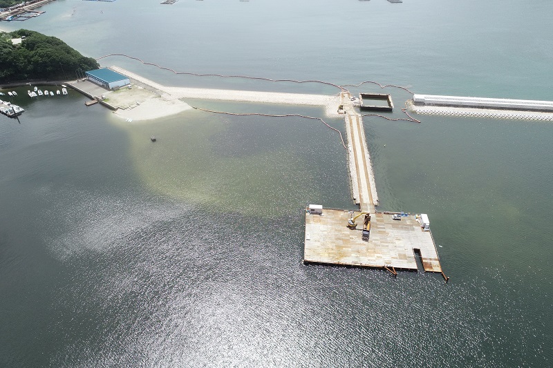 福良港内の既存防波堤改良工事における基礎捨石を据え付ける工事であり被覆ブロックの下地となる部分の工事でした。港内では多くの高潮対策工事が並行して行われており、近隣工区や地元漁協関係者との連絡調整を入念に行う必要がありました。また後続工事との関係もあった為、工程管理がとても重要な工事となりました。度重なる悪天候もありましたが協力業者様や関連工区との協力もあり無事契約後期内に工事を終えることができました。