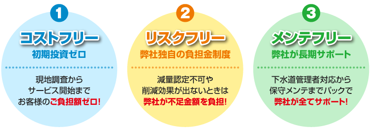 1.コストフリー 初期投資ゼロ 現地調査からサービス開始までお客様のご負担額ゼロ! 2.リスクフリー 弊社独自の負担金制度 減量認定不可や削減効果が出ないときは弊社が不足金額を負担! 3.メンテフリー 弊社が長期サポート 下水道管理者対応から保守メンテまでパックで弊社が全てサポート!
