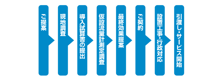 ご提案 現地調査 導入試算書の提出 仮設流量計測定調査 最終効果提案 設置工事・行政対応 引渡し・サービス開始