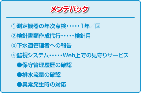 メンテパック ①測定機器の年次点検・・・・・1年/回 ②検針書類作成代行・・・・・検針月 ③下水道管理者への報告 ④監視システム・・・・・Web上での見守りサービス ●保守管理履歴の確認 ●排水流量の確認 ●異常発生時の対応メンテパック