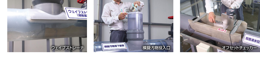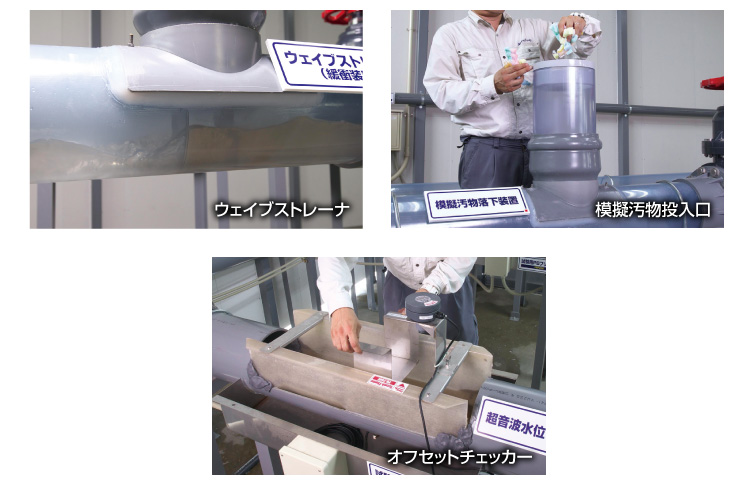 - 落水装置による波立ちや圧力変化を模擬的に再現し、ウェイブストレーナPT(波立ち緩衝器)による、排水流量計の設置制約への現場対応を確認できる
