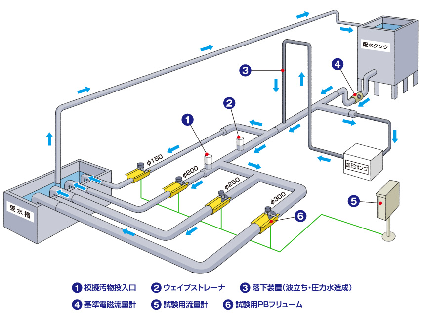 - 主な試験対象は、小口径下水・排水管用のフリューム式・面速式流量計