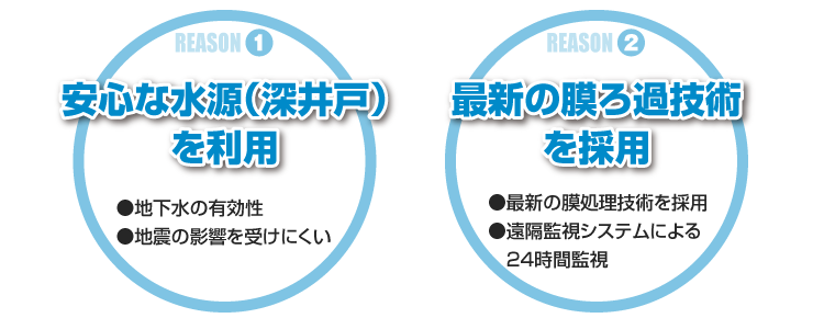 安心な水源(深井戸)を利用 ●地下水の有効性 ●地震の影響を受けにくい 最新の膜ろ過技術を採用 ●最新の膜処理技術を採用 ●遠隔監視システムによる24時間監視